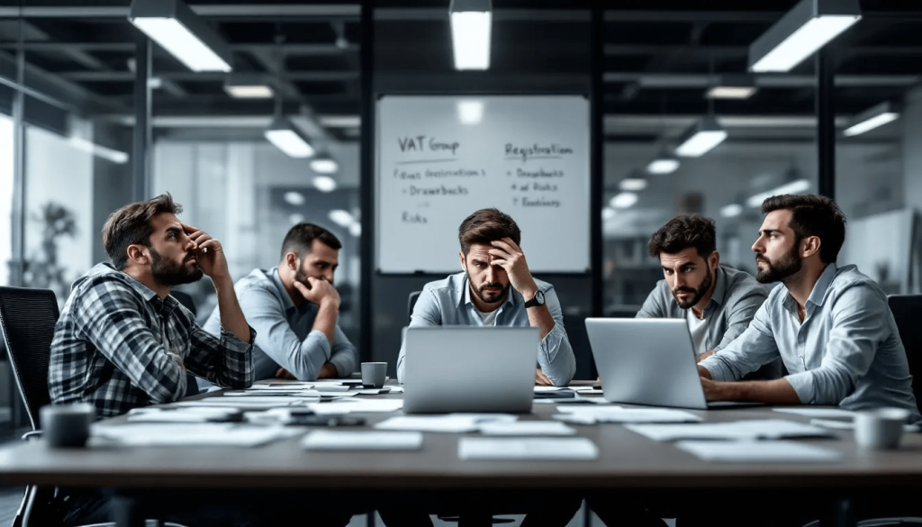 responsibilities of group members. The atmosphere is professional, with legal books and documents visible in the background, reflecting the complexities of VAT accounting and group registrations.)